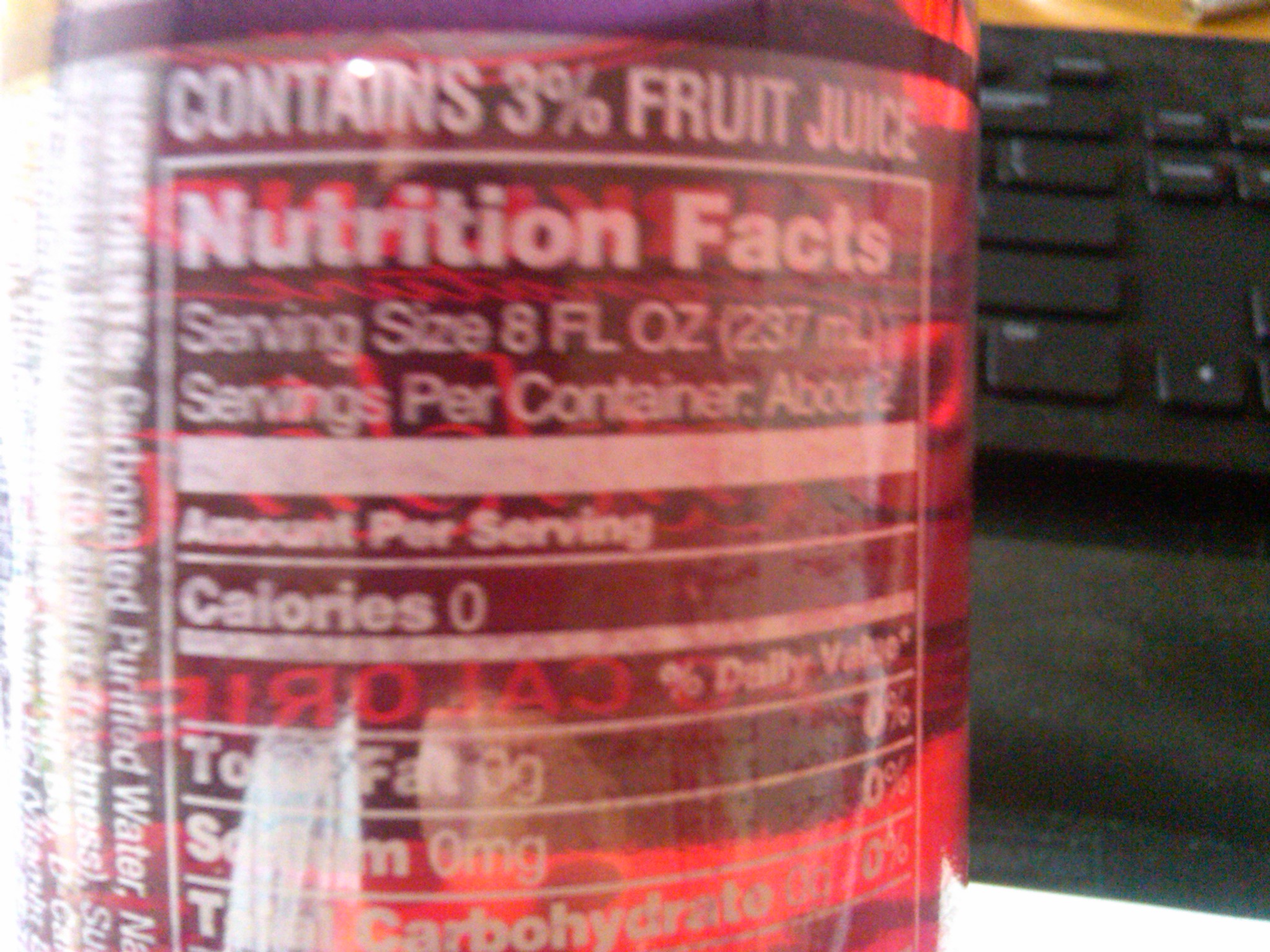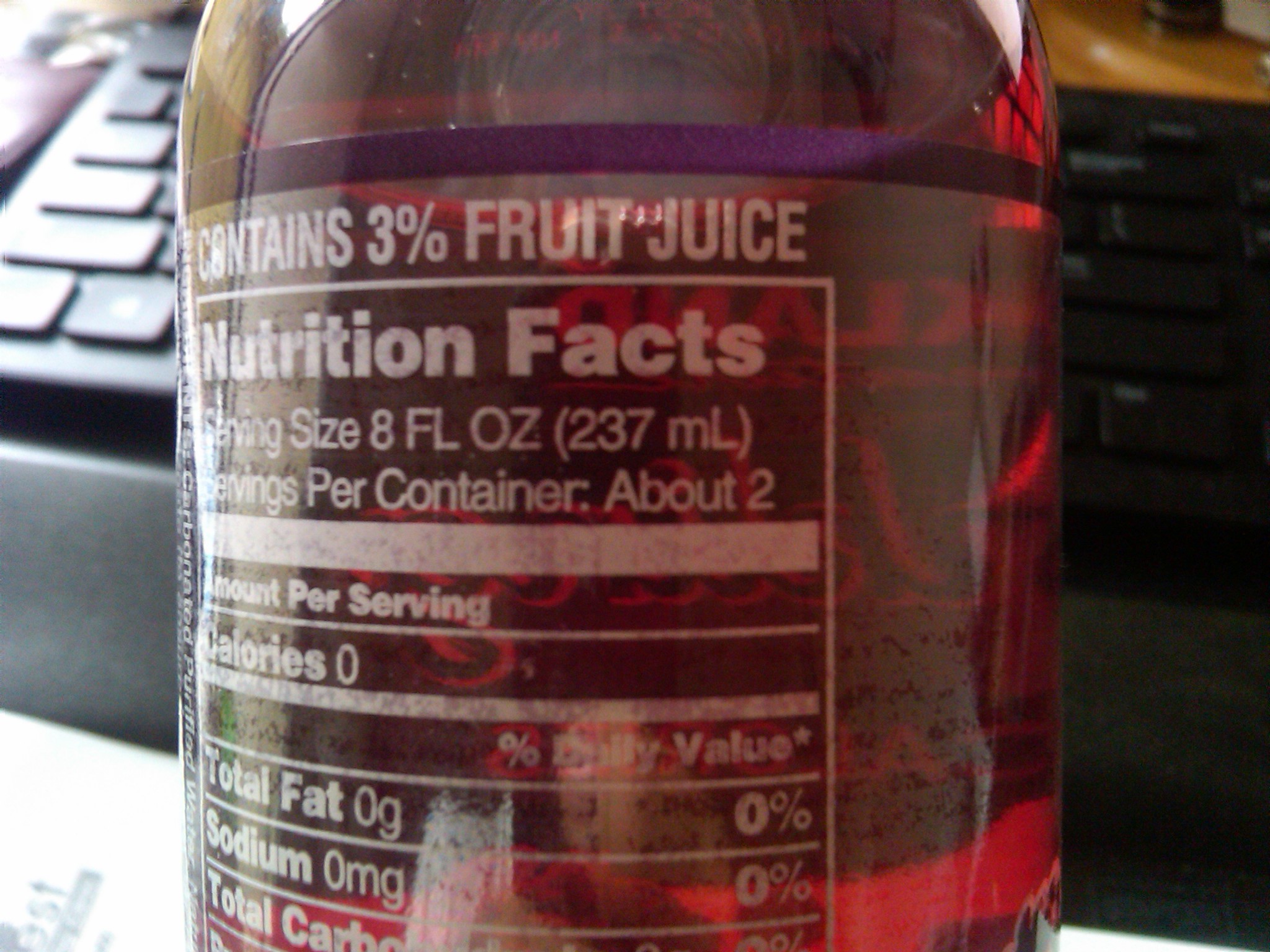 Notice how it says there are 0 Calories. Notice how it says there are 0g carbohydrates. Notice how it also says that it contains 3% fruit juice. If fruit juice is sugar, and sugar is Calories, then how can this drink have 0 Calories?