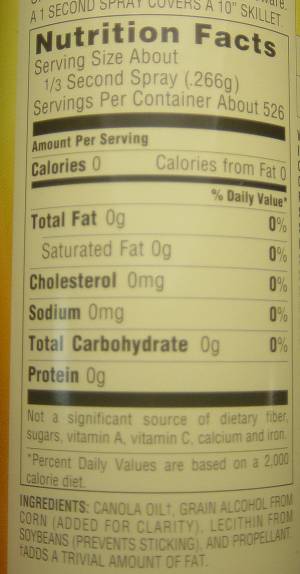 Do you make sure that your spray lasts less than 1/3 of a second so that you’re getting less than 5 calories of oil? Let’s say you spray pretty liberally, and use it during two meals– You could be consuming anywhere from 20 – 40 calories from fat.